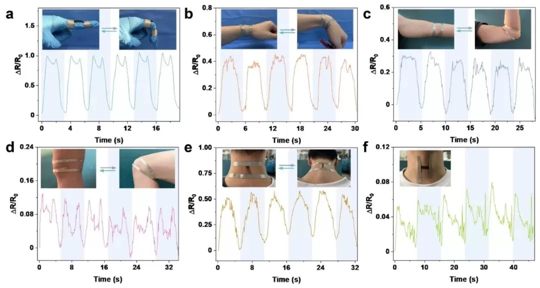 通过将传感器附着在手指、手腕、膝盖等部位,实时记录电阻变化,研究了rGO/TPU传感器在人体运动检测中的应用,结果表明传感器能精准检测手指弯曲、吞咽等细微及大范围动作,适用于可穿戴设备和电子皮肤技术。