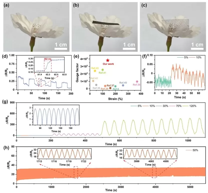 通过将传感器放置在植物的雌蕊上展示其轻质透明特性,测试10%应变下的响应时间,进行不同应变范围的循环测试和5000次50%应变循环,研究了rGO/TPU传感器的机电性能和耐久性,结果表明传感器响应时间约260ms,5000次循环后电阻变化稳定,性能优于同类研究。