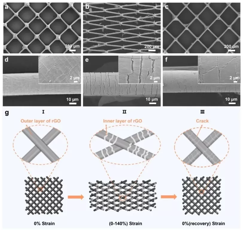 通过SEM观察传感器在不同应变下的结构和表面形貌变化,绘制传感机制示意图,研究了rGO/TPU传感器的拉伸变形过程和导电机制,结果显示应变下rGO层产生裂纹但内部导电路径保持,菱形结构分散应力,使传感器在宽应变范围保持信号检测能力。