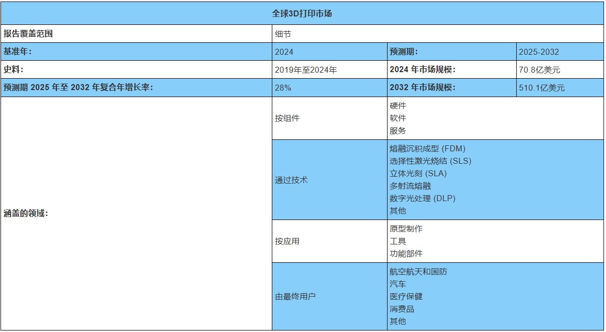 (2025-2032)》报告数据显示:2024 年全球 3D 打印市场规模约为 70.8 亿美元。报告预计从 2025 至 2032 年,该市场将以 28% 的年复合增长率(CAGR)快速扩张,到有望达到 510.1 亿美元。