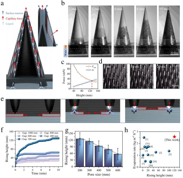 mm的高度,为蒸发过程提供了连续水源。根据杨-拉普拉斯方程,微孔中的弯液面产生向上拉力,与液体重力平衡时达到最大提升高度。较小的孔径(200–600