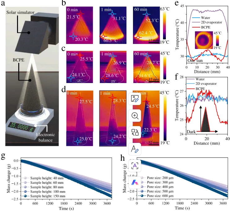 研究团队从竹笋的独特结构中汲取灵感。竹笋内部的垂直微通道和表面微孔能够通过毛细效应高效提升水分,同时其锥形结构有助于分散应力。仿照这一特性,BSCPE设计了内部微间隙和表面横向阶梯状纹理,不仅实现了液体的快速输送,还通过扩大蒸发面积提升了效率。蒸发器的材料以多壁碳纳米管为核心光热成分,均匀分散于紫外光固化丙烯酸酯树脂中,形成了吸光率超过94%的复合光热树脂。这种材料在太阳能照射下可高效转化为热能,为蒸发过程提供持续动力。