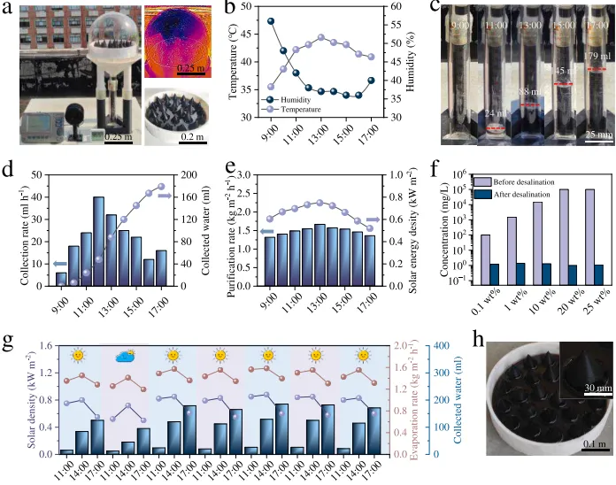 wt%高盐度水和两倍太阳光照下仍能稳定运行,盐结晶可在夜间通过液体上升重新溶解,实现了自清洁功能。在应用验证中,研究团队构建了BSCPE阵列户外淡化装置。使用浙江海域海水晶体模拟溶液,连续7天每天8小时测试显示,净化速率稳定在约1.72
