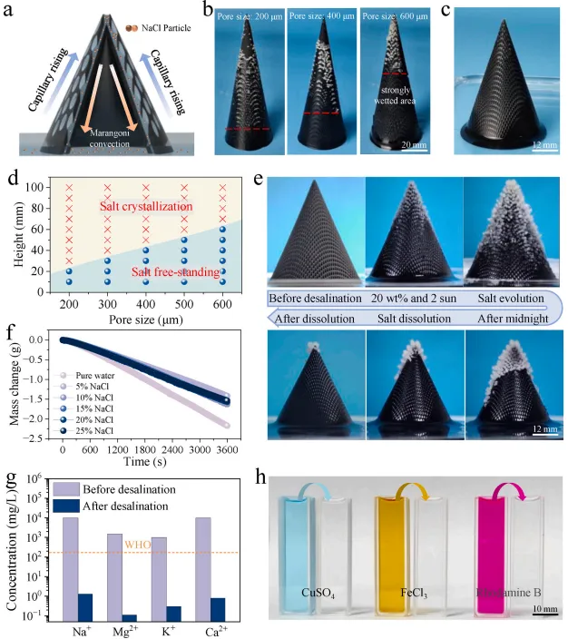 总结:竹笋启发的锥形多孔蒸发器通过仿生结构设计、先进材料与高精度3D打印技术的融合,解决了高盐度海水淡化中的盐结晶和效率瓶颈。未来,该技术有望应用于沿海地区或工业废水处理,为可持续水资源供应提供新路径。研究团队计划进一步优化结构以提升能效,并探索低成本量产方案,推动太阳能淡化的实际应用。