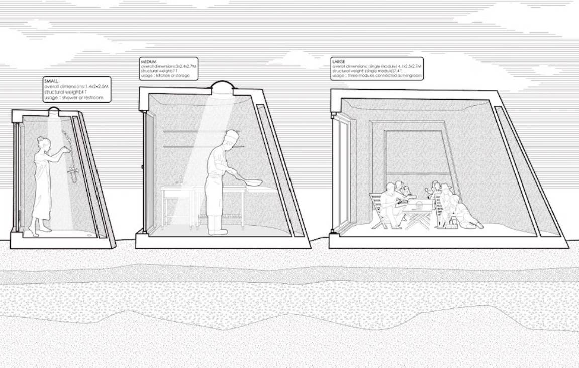 这些房屋模块全部采用3D打印技术制造。打印材料以沙子为主,结构在无锡市预制完成。每个单元被拆分成多个部件,方便运输。运抵沙漠后,仅用两天时间,在当地牧民的协助下就完成了组装。