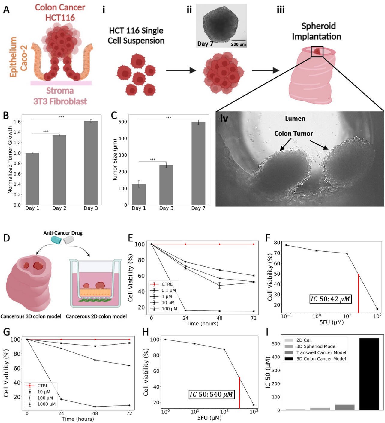 为了测试3D打印模型的真实性,研究人员植入了结肠癌细胞 (HCT116),并用常见的化疗药物 5-氟尿嘧啶 (5-FU)