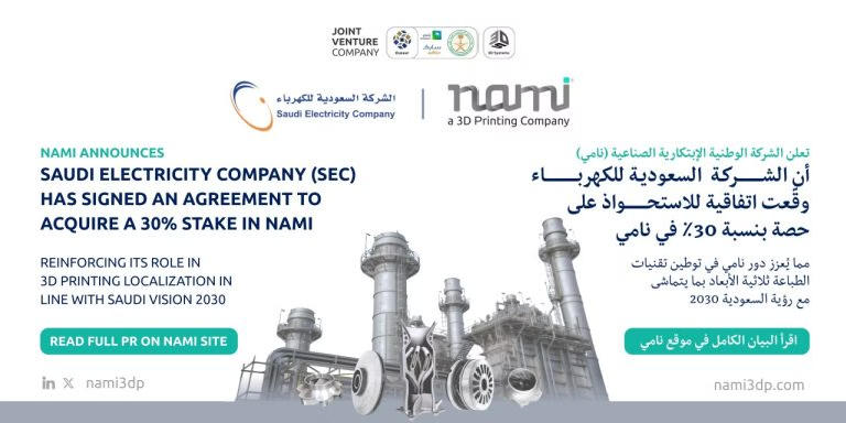 2025年10月26日,沙特电力公司(SEC)宣布,已签署协议收购沙特阿拉伯3D打印服务提供商国家增材制造与创新公司(NAMI)30%的股份,成为该公司战略投资者。未来,SEC将与现有股东Dussur以及美国3D