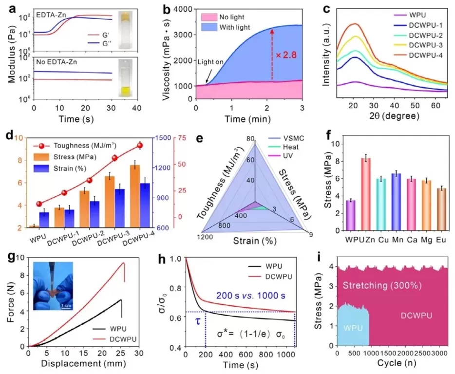 DCWPU的形成及力学性能,运用实时流变测试、粘度测量、X射线衍射、拉伸测试等方法,研究EDTA-Zn对DCWPU金属配位网络形成的影响,以及不同制备条件下DCWPU的力学性能。结果显示,光照可使EDTA-Zn释放Zn²⁺,增加体系粘度,形成金属配位网络;提高EDTA-Zn含量能增强DCWPU的应力、应变和韧性;VSMC策略制备的DCWPU在穿刺、抗蠕变、疲劳抵抗等力学性能上优于传统方法制备的材料。