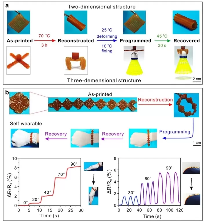 DCWPU在定制智能软设备中的应用,通过3D打印制备DCWPU结构,结合形状重构、形状记忆和导电性测试,研究DCWPU在定制智能软设备中的应用潜力。结果表明,利用VSMC策略与3D打印结合可制备多种复杂DCWPU结构,如3D打印的DCWPU抓手能通过形状重构抓取物体,自愈合特性延长其使用寿命;DCWPU制成的自穿戴3D传感器可通过形状记忆实现贴合穿戴,有效监测人体肢体运动,展现出在软机器人和可穿戴设备领域的应用前景。