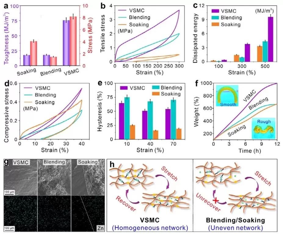 增强力学性能的机制,采用拉伸、压缩循环测试、溶胀测试、扫描电子显微镜(SEM)观察等方法,对比浸泡法、共混法和VSMC策略制备的DCWPU,研究DCWPU增强力学性能的机制。结果表明,VSMC策略制备的DCWPU具有更均匀的交联网络,在拉伸时能量耗散效率更高,压缩时滞后环面积更小,溶胀后结构更稳定,SEM下微观结构更均匀,证实其优异力学性能源于均匀分布的金属