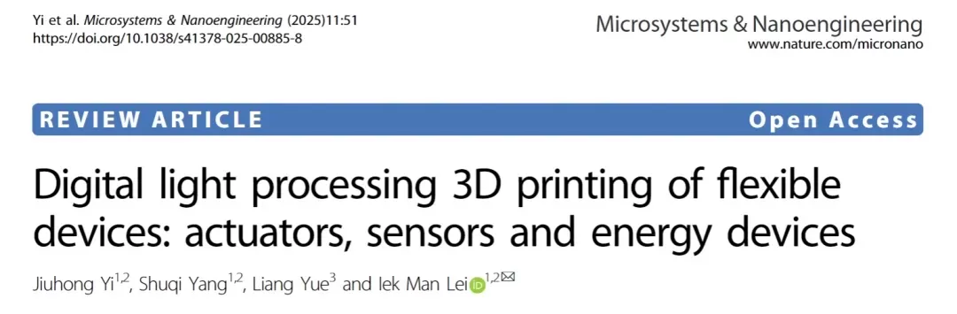 Lei教授团队综述了数字光处理(DLP)3D打印在柔性器件领域的研究进展,重点聚焦于软执行器、柔性传感器和柔性能源器件,探讨了DLP打印技术及可打印材料的发展对这些器件的结构设计、灵敏度、机械性能和整体功能的提升作用,提出了DLP打印技术在柔性器件领域面临的挑战及未来发展前景的观点。相关工作以“Digital