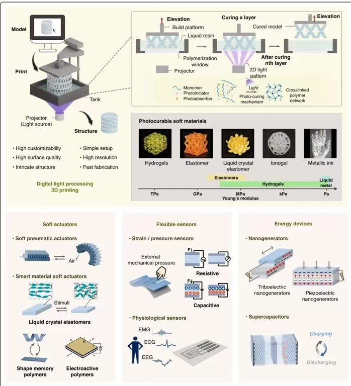 3D打印技术的核心流程(CAD设计→切片分层→逐层光固化)及关键组件(投影仪、树脂槽、构建平台)。研究对象涵盖可打印材料体系(水凝胶、弹性体、离子凝胶、液态金属等)及目标器件类型(软执行器、柔性传感器、能源器件)。结果表明,DLP凭借高分辨率(可达1