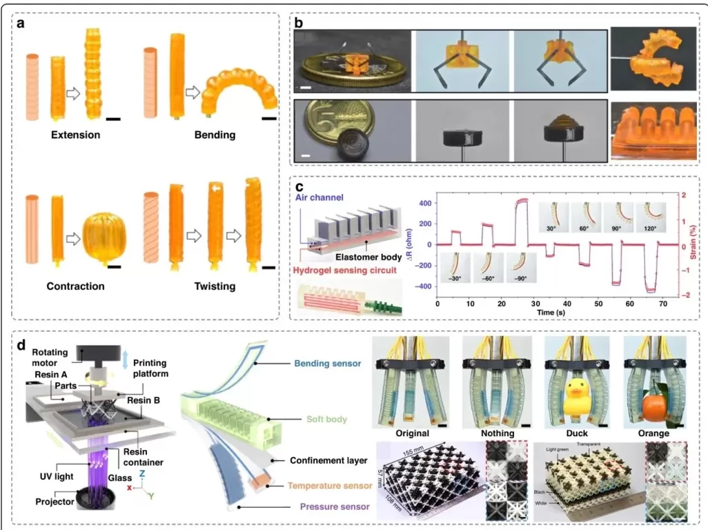 采用灰度数字光处理(g-DLP)、多材料打印及离心力辅助等研究方法,探究了气动执行器的结构设计与性能调控。针对g-DLP,通过灰度光强控制树脂交联密度,制备出非均质刚度执行器,可实现拉伸/收缩/弯曲/扭转等多模式运动;对于多材料打印,结合刚性-柔性复合结构(如弹性体基体+导电水凝胶传感电路),开发出兼具驱动与感知功能的集成器件。结果表明,离心多材料技术通过非接触式清洗避免材料污染,成功制备五材料复合执行器,集成弯曲、压力、温度传感能力。