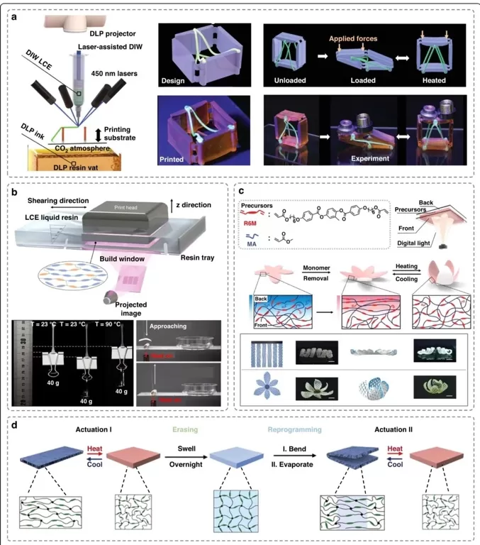 g的热响应执行器;借助平面光衰减法,在25秒内构建交联密度梯度,引导介晶定向排列,实现定制化弯曲/扭转运动;通过溶剂蒸发过程中拉伸处理,赋予液晶有机凝胶执行器可擦除/重编程特性。结果表明,DLP与DIW混合打印技术可构建自由站立的LCEs结构,拓展其在张力完整性系统中的应用。