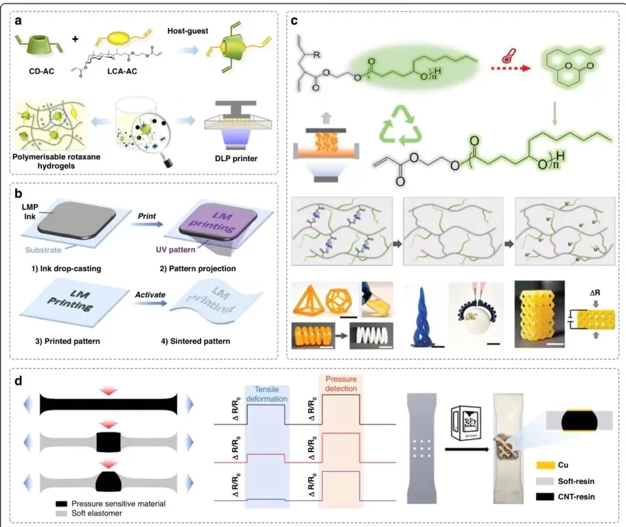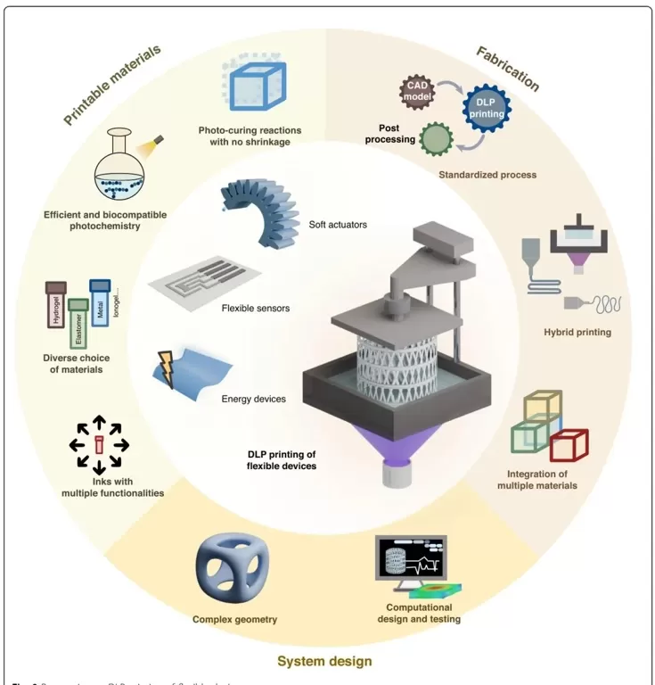 μm)、快速打印(优于逐点固化的SLA)和多材料兼容性,显著提升了柔性器件的结构复杂度与功能集成度。