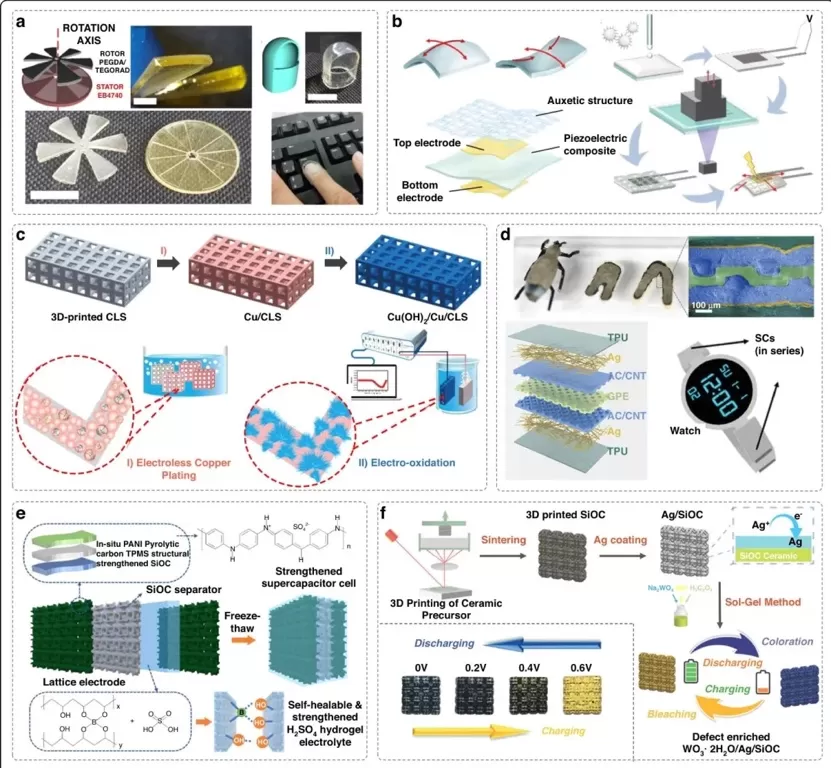 nC/cm²,同时兼具除尘功能。负泊松比结构PENG将弯曲形变转化为拉伸形变,能量转换效率提升40%。通过DLP技术和电化学氧化方法可制备基于海胆状Cu(OH)2晶格电极的可调电容超级电容器。这种三维微晶格电极的高比表面积显著提升了器件的电化学性能和机械性能。同时,随着晶格配位数的增加,电极材料的比电容和机械强度呈现同步增强的特性。类似地,DLP技术还可用于制备准固态超级电容器所用的多孔石墨烯基分级复合微晶格电极,这种跨纳米至毫米尺度的分级多孔微晶格结构,使该超级电容器同时具备高能量密度(0.008