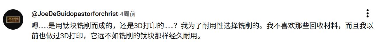 △嗯.….是用钛块铣削而成的,还是3D打印的.…?我为了耐用性选择铣削的。我不喜欢那些回收材料,而且我以前也做过3D打印,它远不如铣削的钛块那样经久耐用。