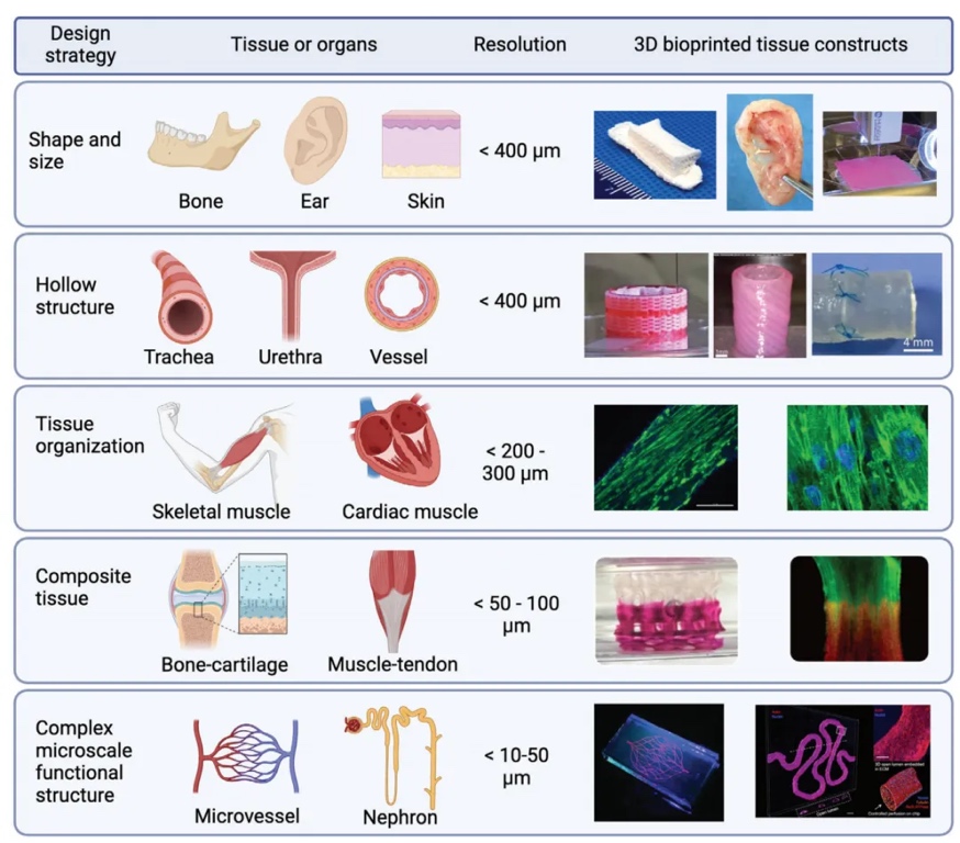 生物3D打印策略旨在创建适合临床应用的组织构造,并有可能设计各种组织类型。制造组织或器官的主要考虑因素之一是必须采用能够准确模拟目标组织或器官结构和功能的设计策略。这需要深入了解被复制的组织或器官的解剖和功能方面。生物3D打印的优势在于它能够有效地实施这种设计策略,从而可以创建与其自然等同物非常相似的精确组织或器官模型。
