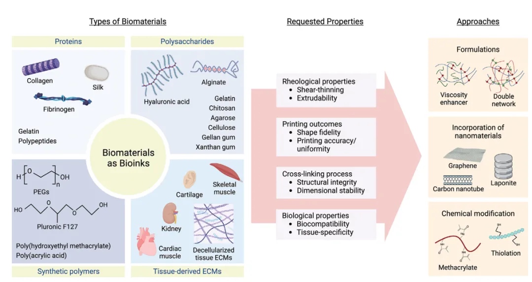 随后,作者详细介绍了生物墨水(Bioinks)的种类、特性以及在3D生物打印中的应用(图2)。生物墨水主要由水性和水凝胶配方组成,其中包括自然来源的材料如胶原蛋白、明胶、藻酸盐等,以及合成材料如聚乙二醇二丙烯酸酯(PEGDA)。这些墨水设计用于在打印过程中支持细胞生存,具有适宜的机械性能和生物相容性。作者进一步讨论了如何通过调整水凝胶的物理和化学交联方式,改善生物墨水的打印性能。例如,增加水凝胶的浓度可以提高其粘度,从而改善打印过程中的形状保持能力和结构完整性。整体而言,这一部分强调了生物墨水在3D生物打印中的核心作用,其配方和性质直接影响打印过程的效率和打印结构的质量。通过不断优化和创新生物墨水的配方,可以显著提升生物打印技术在组织工程和再生医学中的应用潜力。