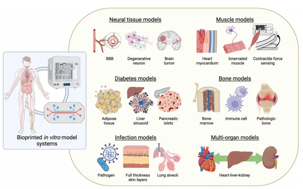 鉴于组织和器官固有的复杂性,其特点是细胞类型多样、几何排列特定,生物3D打印对于提高体外模型的准确性至关重要。为了获得与天然功能和表型紧密复制的组织模型,它们必须经历成熟过程。这涉及动态培养条件,例如灌注环境、机械和电刺激以及多种细胞类型的共培养。图5说明了各种组织模型的功能分类,包括神经生理、肌肉功能、代谢疾病、骨骼和造血、感染和多器官相互作用系统。当前的研究重点是改进这些模型,以更好地解决特定的组织特征和应用。技术的进步正在推动生物3D打印体外组织系统的进步,该系统针对一系列组织和器官模型进行了量身定制。