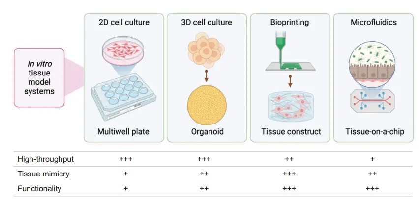 在传统的体外组织建模中,细胞通常在2D条件下培养,例如在组织培养板中,这是一种基本方法。然而,某些细胞类型在这种条件下可能会失去其自然特性和功能。为了解决这个问题并为细胞提供更逼真的环境,人们采用了替代方法(图4)。先进的技术包括将细胞培养为聚集体(球体)或类器官,利用3D生物打印创建复杂的组织/器官结构,以及集成微流体平台以支持动态微环境。虽然2D和3D细胞培养系统都具有高通量筛选能力,但它们可能无法模拟天然组织的复杂性和功能。相比之下,基于微流体的组织芯片在复制组织复杂性方面表现出色,但可能需要更适合高通量应用。