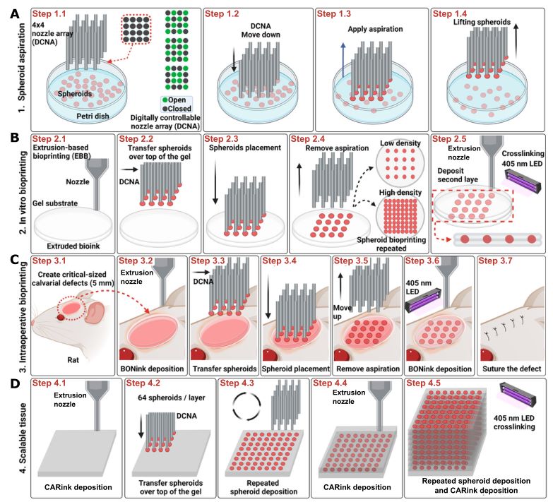 Ozbolat教授及其团队提出的新技术——HITS-Bio,利用球状体(即细胞簇)作为构建单元来制造复杂的3D组织。球状体是一种三维细胞集合体,其细胞密度与人体组织相似,因此被认为是实现高密度组织生物打印的理想材料。尽管球状体提供了更好的细胞密度,但之前的生物打印方法由于缺乏高效的可扩展技术和精确控制能力,仍然难以满足实际需求。为了解决这些问题,研究团队设计了一个数字控制喷嘴阵列,该阵列可以在三维空间中移动,并允许同时操纵多个球状体。
