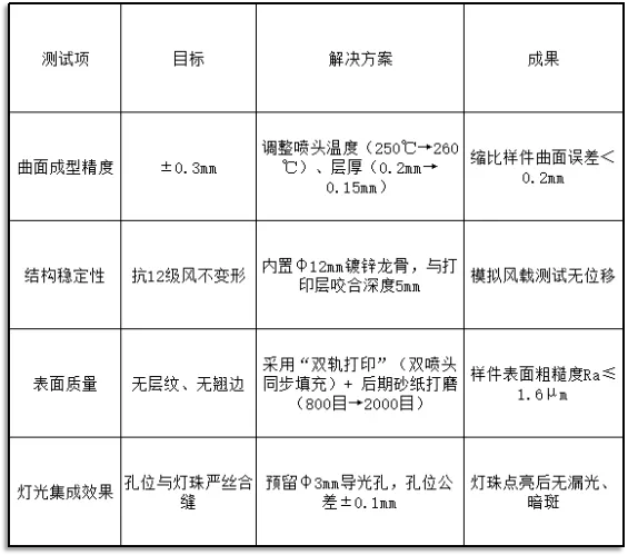 “大尺寸打印最怕‘首件失败’。”生产主管冯工坦言。为验证模型可行性,团队决定先制作1:10缩比样件(高1.65米),并针对4项核心技术进行测试: