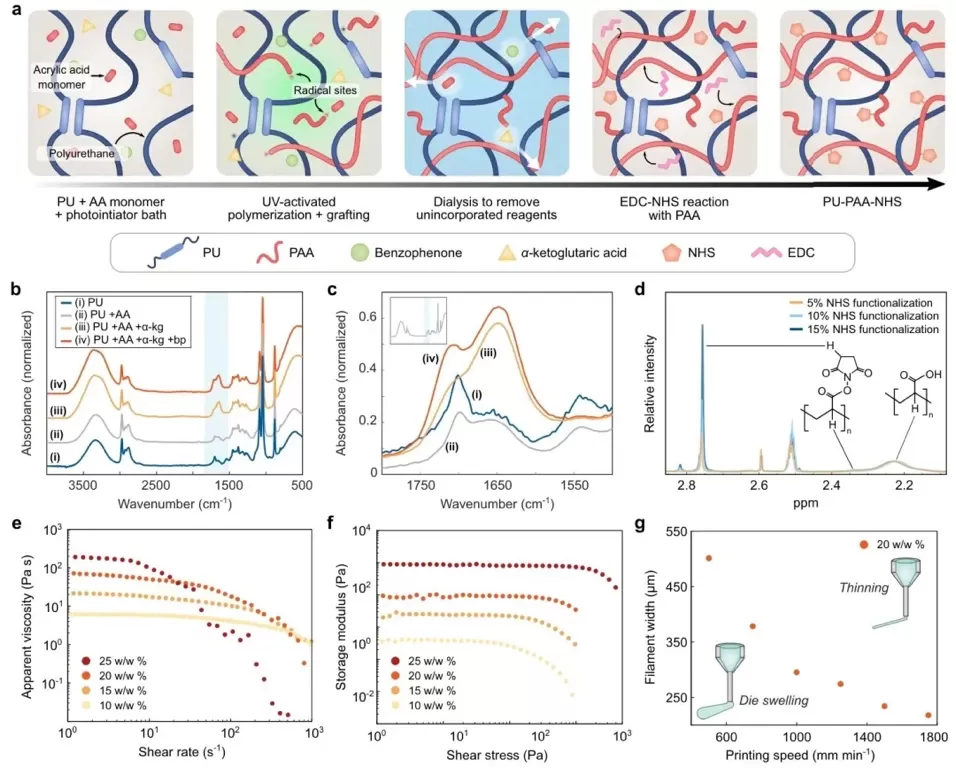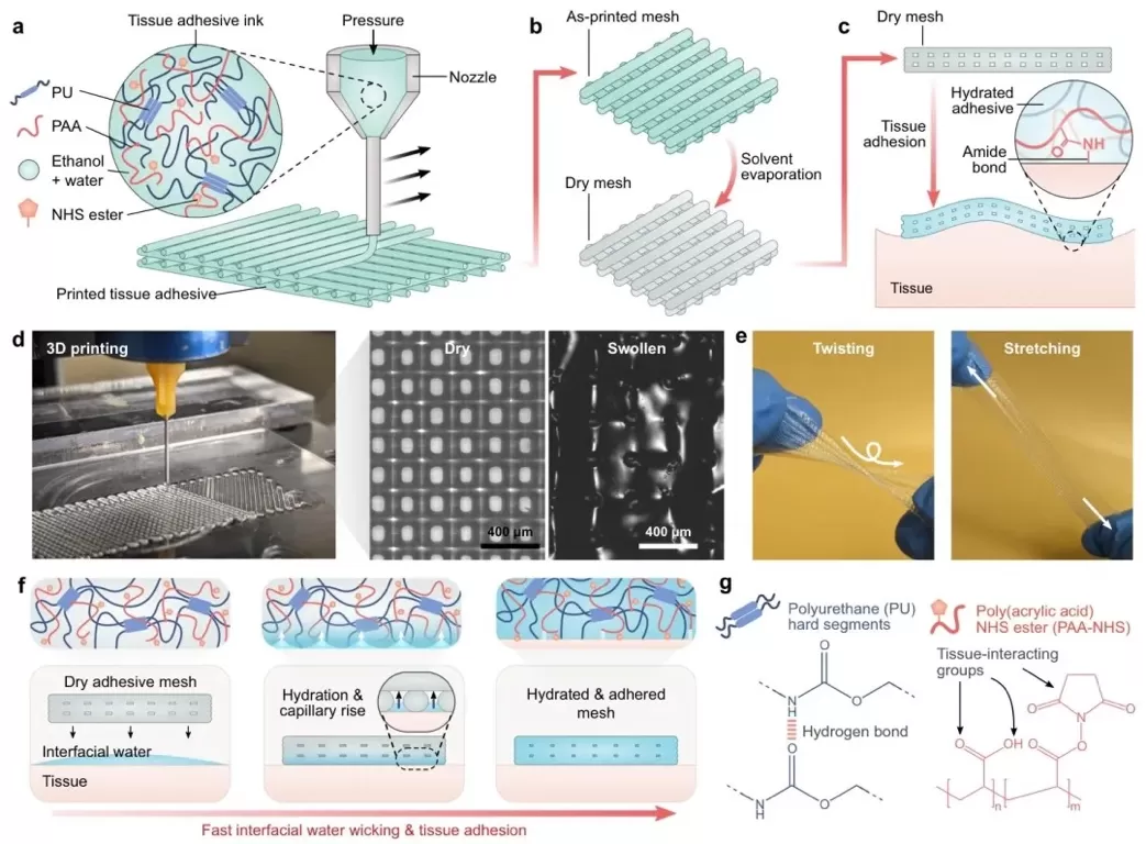 NHS酯和PU组成的聚合物网络,该材料可制成墨水用于3D打印,打印的粘合剂能通过水合和毛细管作用迅速与组织表面形成分子间和共价键,实现快速且牢固的粘附。