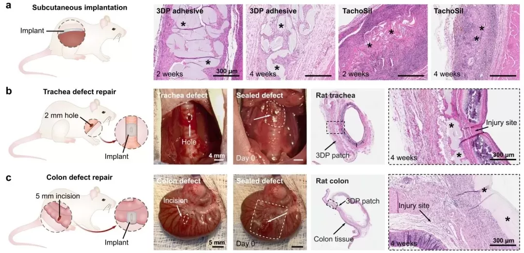 CT成像等技术,研究3D可打印组织粘合剂在大鼠体内的生物相容性以及对气管和结肠缺损的修复效果。结果显示,该粘合剂在大鼠皮下植入后炎症反应轻微,且逐渐降解;在气管和结肠缺损修复实验中,打印的贴片能有效密封缺损,4周后组织修复良好,无明显渗漏和炎症,表明其生物相容性良好且修复效果显著。