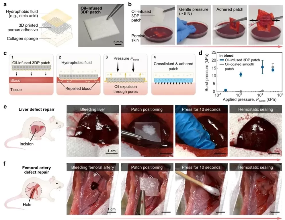 用于抗血液粘附的液体注入式3D打印贴片,借助理论分析、体外实验和体内实验,研究液体注入式3D打印贴片在血液存在下的粘附性能和止血效果。结果表明,该贴片利用疏水性液体和多孔结构,能有效排斥血液,在较低压力下实现与组织的紧密粘附;在大鼠肝脏和股动脉出血模型实验中,可在10秒内实现止血密封,展现出良好的抗血液粘附和止血能力。