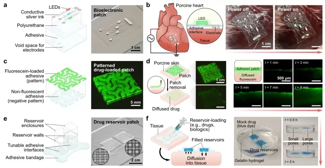 NHS酯和PU构成的聚合物网络,使其能制成适用于3D打印的粘弹性墨水。这种粘合剂可快速与湿组织牢固粘附,生物相容性良好,还能通过调整打印参数改变机械性能。团队利用该粘合剂打印出多种功能性贴片和装置,在大鼠体内实验中,成功修复了气管和结肠的缺损,还设计出可抗血液干扰的液体注入式贴片。此外,他们还探索了其在生物电子和药物递送领域的应用潜力。相关工作以“A