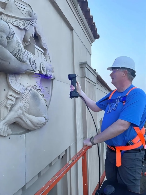福特工程实验室坐落于密歇根州迪尔伯恩市,由当地著名建筑师阿尔伯特·卡恩设计并打造,它是一个拥有广阔占地面积的开放式办公空间。这座建筑的三个外立面均装饰有精美的雕刻艺术品,共计有17件。该实验室近期在进行重新装修,包括建筑外墙也都需要进行清洗和翻新。客户比较担心使用化学清洗剂或者用电动水枪等设备在对砂岩墙进行清洁的时候,会对其造成二次伤害,且因为缺乏原始的设计稿,后续复刻或者维修都可能无据可依。因此客户迫切需要为这些雕刻艺术品进行建档,为后续的保护维修提供溯源基础。