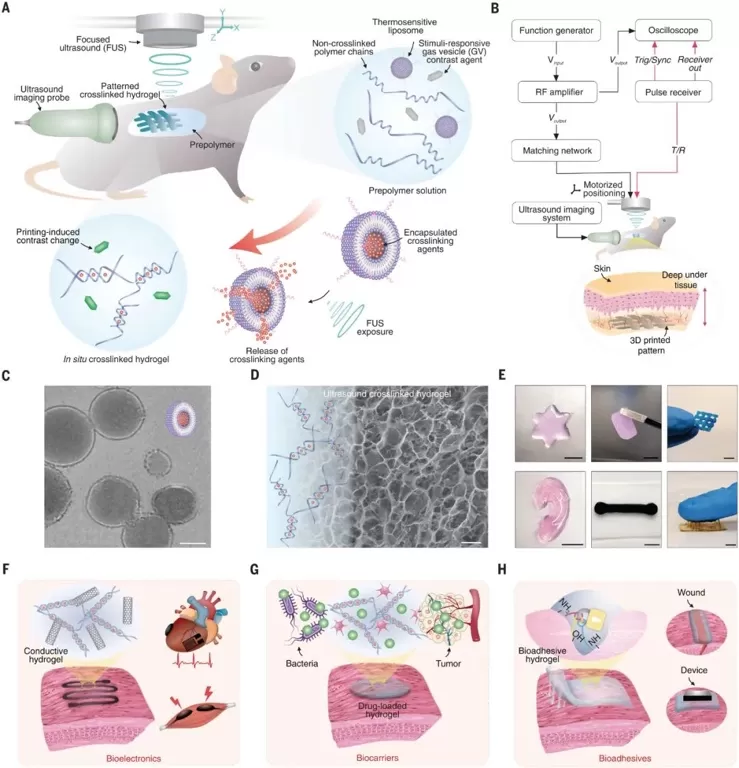 使用声波进行体内打印的功能性水凝胶结构。比例尺为5毫米。 F-H.