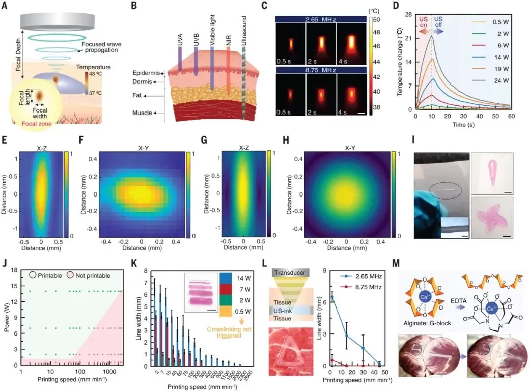 2. 声波聚焦技术的应用: 使用聚焦超声波(FUS)技术,通过自动定位系统将FUS聚焦点精确定位在US-ink上。 FUS引发局部加热,导致LTSLs释放交联剂,实现US-ink的即时原位交联。