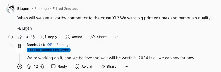 南极熊认为,拓竹如果发布一款双挤出的大型3D打印机,将进一步巩固它在高端桌面3D打印市场的地位。双挤出技术的引入尤其值得期待,因为这可能会显著提升打印的多材料、多色能力。