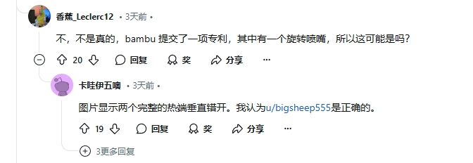 泄露的图片似乎展示了一个双挤出系统的热端设计,与拓竹过去的相关专利和联合创始人Huaiyu“Sprite”Liu的公开声明一致。他表示:“每个人都想要一台更大的打印机,所以我们必须努力改进。但仅仅让它变大还不够。我们知道人们有更高的期望,所以我们不会只制造一台更大的打印机。我们希望为我们的下一款机型带来更多创新。”此外,图片还显示了疑似新材料管理系统AMS