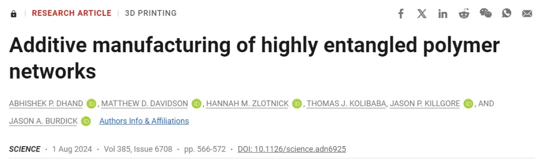 Burdick团队在《Science》上发表了一篇名为“Additive manufacturing of highly entangled