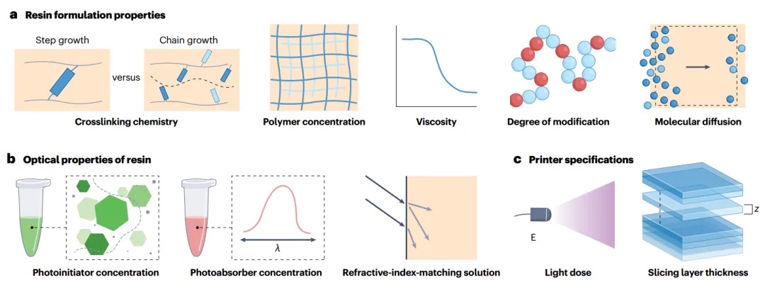 光聚合反应中使用的树脂是各种反应性分子和添加剂的溶液,这些分子和添加剂可实现凝胶化,即树脂在光照下从液体转变为固体。在基于DLP和VAM的水凝胶打印中,必须考虑树脂配方的关键参数(图1a、b)。打印机规格(例如光源和强度、切片层厚度、光学分辨率、构建板移动速度或槽旋转速度)也会对基于光刻的水凝胶打印产生相当大的影响(图1c)。
