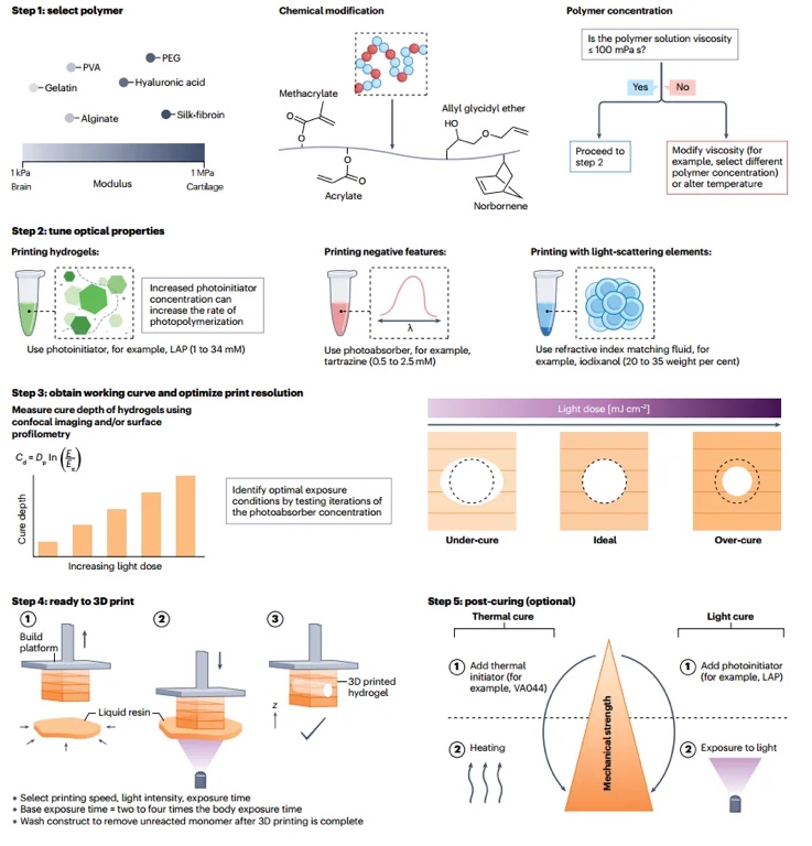 接着,作者提供了基于光刻技术打印水凝胶时需要考虑的步骤指南(图2)。鉴于低成本商用DLP打印机的普及,本指南重点介绍基于DLP的3D水凝胶打印,以便首次使用者能够轻松掌握,主要步骤包括选择聚合物、调整光学特性、获取工作曲线,优化打印分辨率、准备进行3D打印以及辅助硬化。