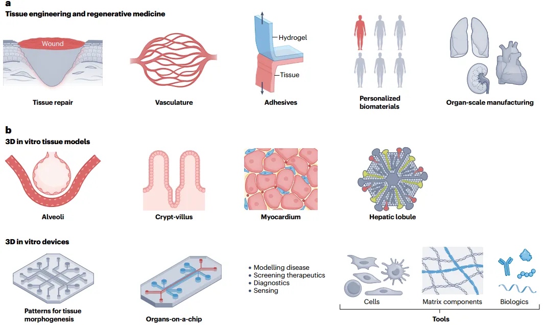 生物3D打印组织可以作为筛选患者来源细胞中药物反应的平台,并包括能够预测药物性能的转录谱(图3b)。除了筛选之外,体外3D系统还可以模拟健康或患病组织,以研究发育和疾病进展。此类平台允许以受控方式研究细胞串扰和细胞与细胞外基质之间的相互作用