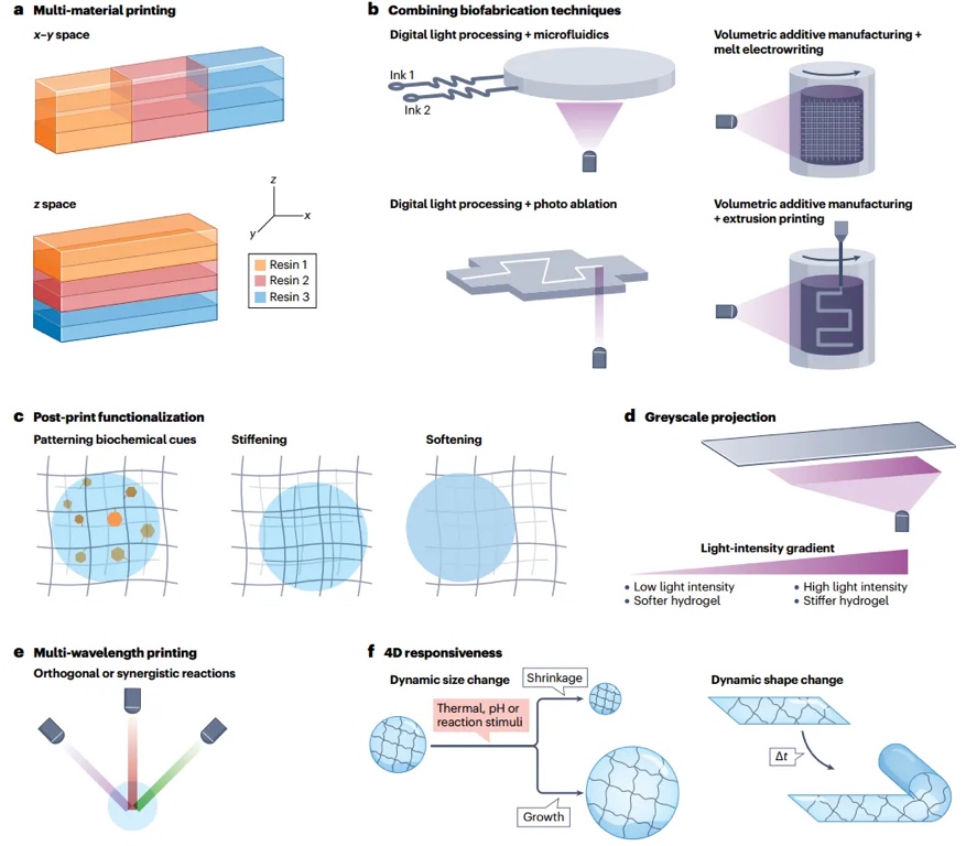 许多方法使用户能够灵活地在3D打印中对细胞和材料进行图案化。例如,可以在x-y和z方向上进行多材料光聚合(图4a)。基于光刻的印刷技术可以与其他制造方法相结合,例如微流体、挤压印刷、熔融电写和基于多光子的激光烧蚀(图4b)。打印后,水凝胶可以用生化线索进行后功能化,并且可以进行空间硬化或软化(图4c)。此外,水凝胶的灰度3D打印可用于控制机械异质性或创建生化线索的梯度(图4d)。光聚合还可以用多种协同或正交波长的光进行(图4e);还可以通过4D打印水凝胶来设计响应性材料(图4f),这些水凝胶响应外部触发,随时间(Δt)发生尺寸或形状的动态变化。