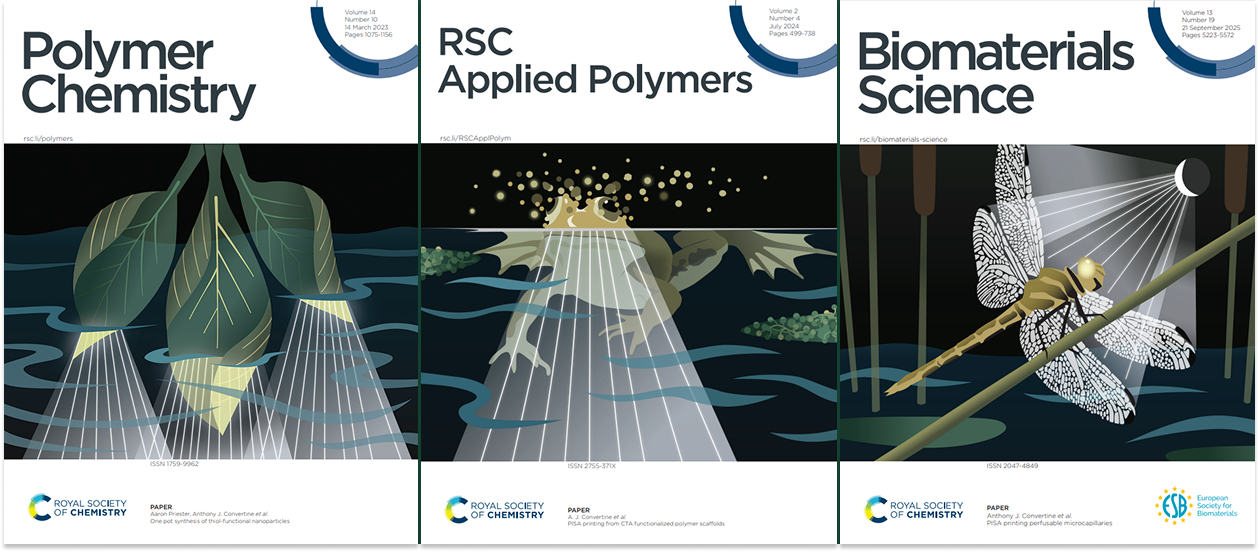 此前,2024 年RSC 应用聚合物杂志上题为“PISA printing from CTA functionalized polymer scaffolds”的封面文章重点介绍了如何通过添加额外的链转移剂基团来改性液态树脂,从而提高打印效率并制备出更硬、高度交联的材料。2023 年聚合物化学杂志的题为“One pot synthesis of thiol-functional nanoparticles”的封面文章重点介绍了如何通过添加额外的链转移剂基团来改性液态树脂,从而提高打印效率并制备出更硬、高度交联的材料。2023 年聚合物化学杂志的封面文章则介绍了一种利用聚合诱导自组装的树脂,可在光打印过程中形成纳米结构网络,并可用于组织支架应用。
