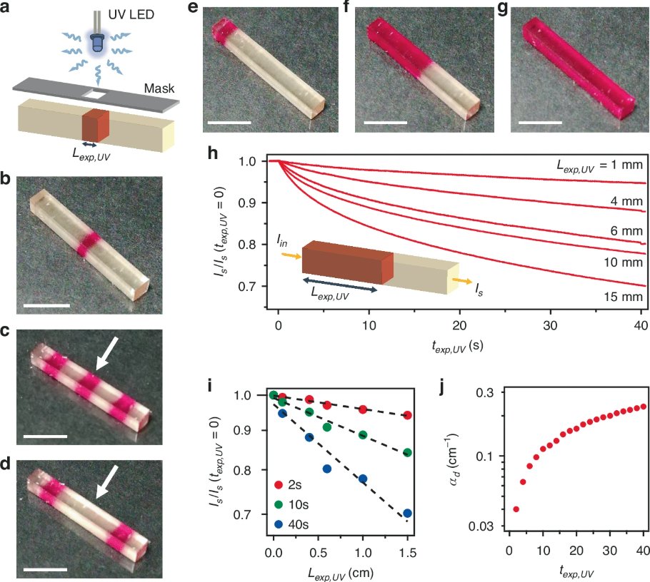 研究人员证明,空间选择性照明可以动态地重新配置3D打印材料内部的光传播。当通过阴影掩模照射特定区域时,可以使用交替的紫外光和绿光来写入、擦除和重新写入颜色变化区域。这种方法实现了对打印板材上光衰减的实时调制。