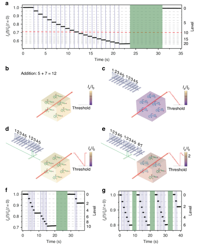 基于SP的器件被用于执行全光算术运算。每个紫外脉冲代表一个递增步骤,逐步将聚合物从透明状态转变为有色状态,从而降低透射光强度。一旦达到阈值,一个绿色脉冲就会将器件重置为初始的无色状态。利用这一过程,研究人员进行了诸如“5