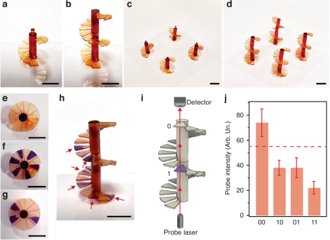 △垂直堆叠的3D打印光致变色处理器。图片来自《光:科学与应用》。