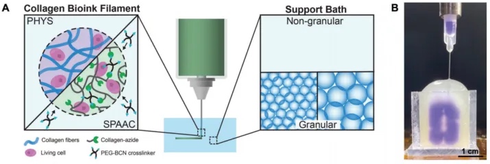 材料设计:文献中使用了两种类型的胶原墨水来进行嵌入式3D生物打印:物理自组装的胶原(PHYS)和通过生物正交点击化学交联的胶原(SPAAC)。PHYS胶原通过在生理温度下形成纤维自组装成凝胶,而SPAAC胶原则通过一种应变促进的叠氮-炔环加成反应(strain-promoted