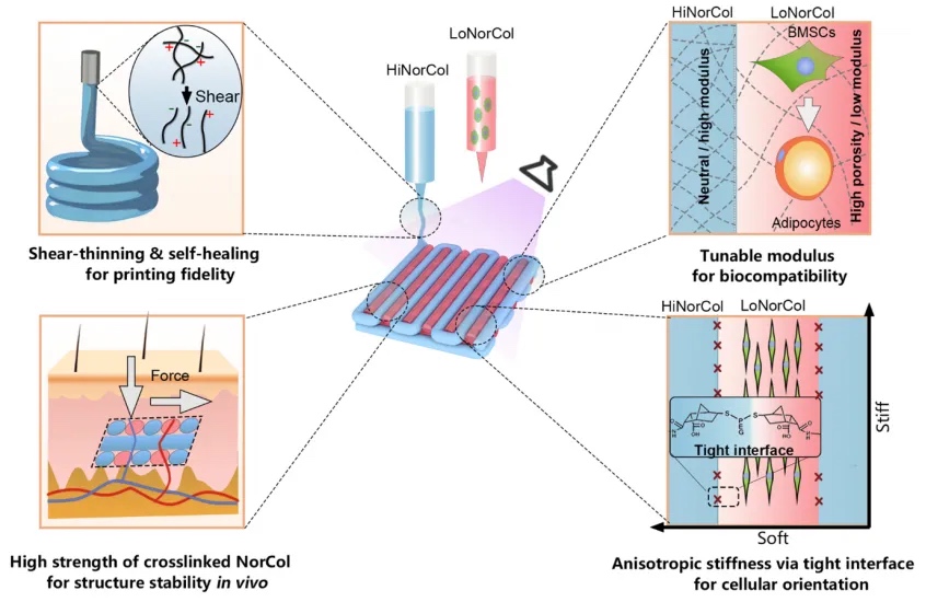 材料设计:该研究设计了一种基于光交联的中性溶解胶原(NorCol)的生物墨水,用于打印具有细胞可编程取向的可植入结缔组织。NorCol通过将酸溶性胶原与5-降冰片烯-2,3-二羧酸酐反应合成,保留了完整的胶原分子结构,具有出色的剪切变稀和自愈性能。通过调整打印过程中自由硫醇基的数量和原位辐照强度,实现支撑材料与细胞负载水凝胶之间的稳定粘附界面,从而构建几何结构引导和模量无关的各向异性机械环境,促进细胞取向。