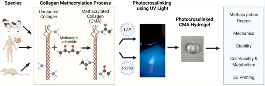 材料设计:该研究设计了基于甲基丙烯酸化胶原(CMA)的光敏水凝胶,用于细胞负载和3D生物打印。通过对牛、人体和大鼠三种不同来源的胶原进行甲基丙烯酸化处理,制备了CMA水凝胶。研究评估了不同来源的胶原、不同提取方法(酸提取与胃蛋白酶消化)以及不同光引发剂(Irgacure-2959和LAP)对CMA水凝胶的机械性能、细胞相容性和打印适应性的影响。