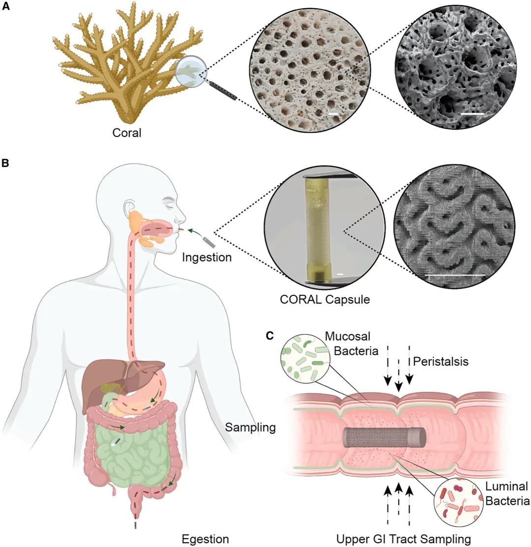 纽约大学阿布扎比分校的研究团队开发出一种仿生珊瑚(CORAL)胶囊,实现了对上部肠道微生物组的被动采样。研究团队从海洋珊瑚的精细结构中获得了设计灵感。珊瑚凭借其复杂多孔的结构,成为了海洋中微生物群落的理想栖息地。这种结构具有高比表面积、高效的营养交换能力和出色的结构完整性,正是肠道微生物采样所需的特性。这一突破性研究成果以“Passive