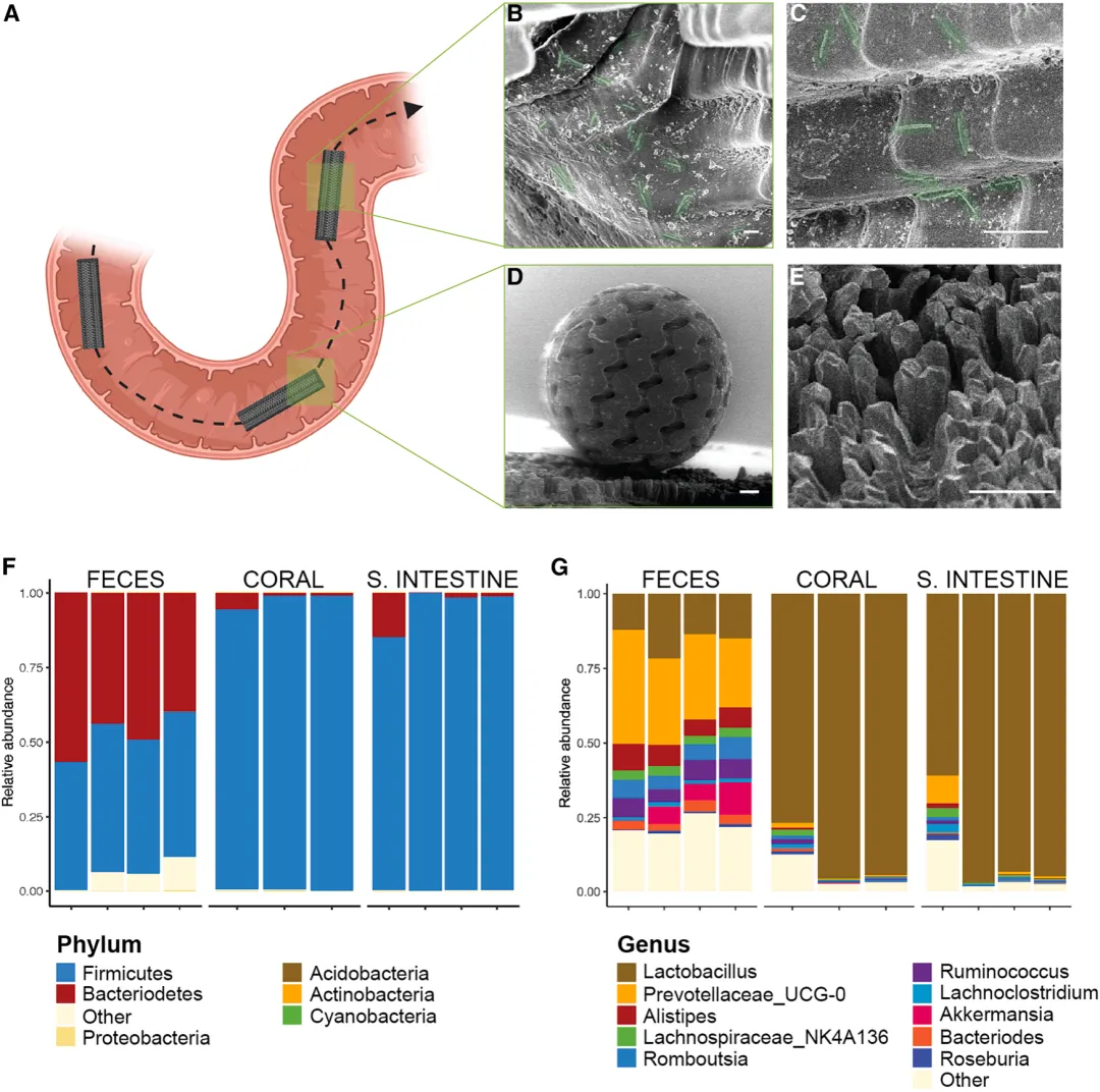 研究团队首先通过离体实验验证了CORAL胶囊的采样能力。将胶囊通过新鲜采集的大鼠小肠段后,扫描电子显微镜图像清晰显示了胶囊孔隙内和表面富集的细菌(图3)。更重要的是,16S